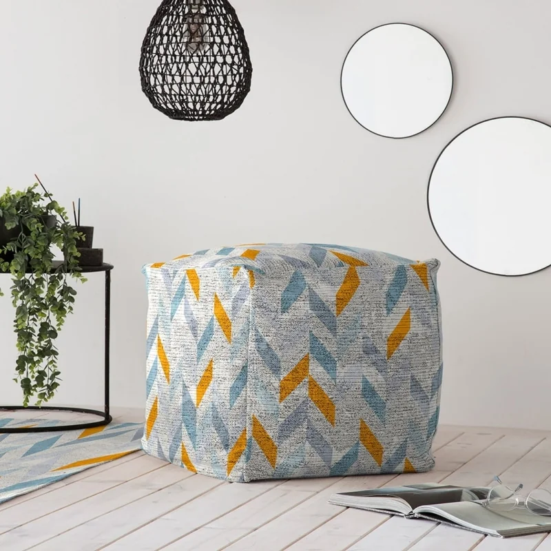 Der Rodier Ennaes Pouf ist ein moderner und mehrfarbiger Pouf. Ennaes besteht aus einer Zeichnung, die aus mehreren geometrischen Figuren in verschiedenen Blautönen besteht, kombiniert mit anderen in goldenem Ocker auf weißem Hintergrund. Ennaes kann an verschiedene Dekorationsstile angepasst werden, aber seine Pastelltöne und hauptsächlich kalten Farben machen es ideal für Dekorationen im nordischen Stil. Ennaes wird in Spanien aus 100 % recycelter Baumwolle hergestellt. Vergessen Sie nicht, es mit dem passenden Teppich zu kombinieren. Erhältlich in zwei Größen