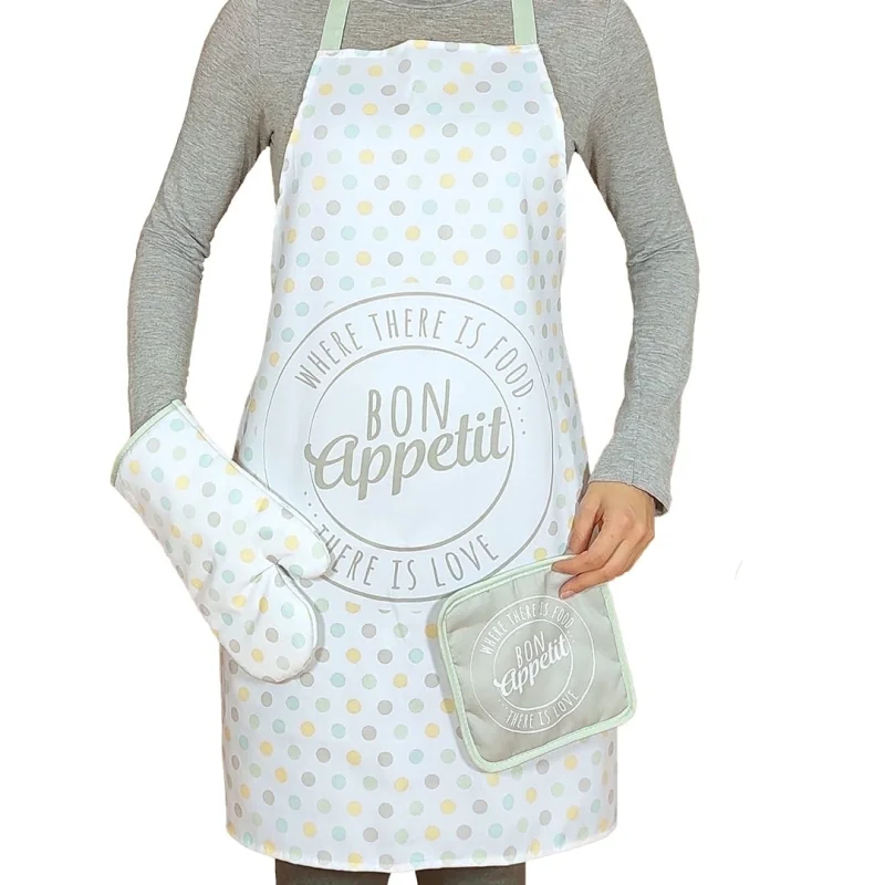 Naf Naf 3-teiliges Küchenschürzenpaket, inklusive Ofenhandschuh und Topflappen. Guten Appetit-Modell. 100% Polyester.