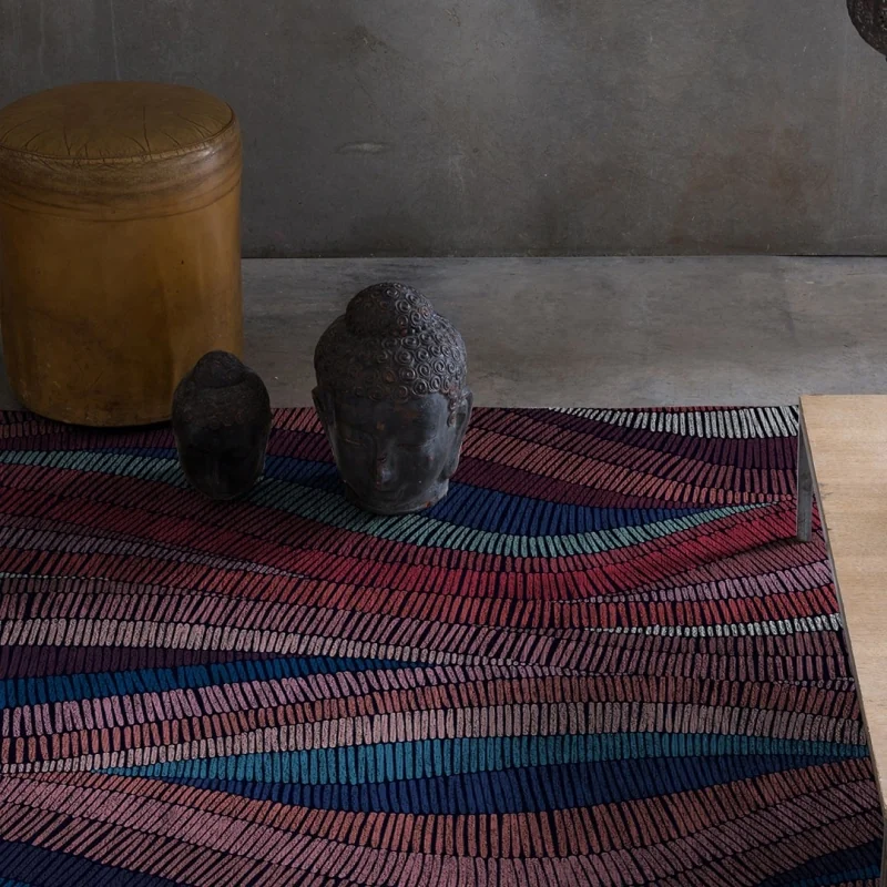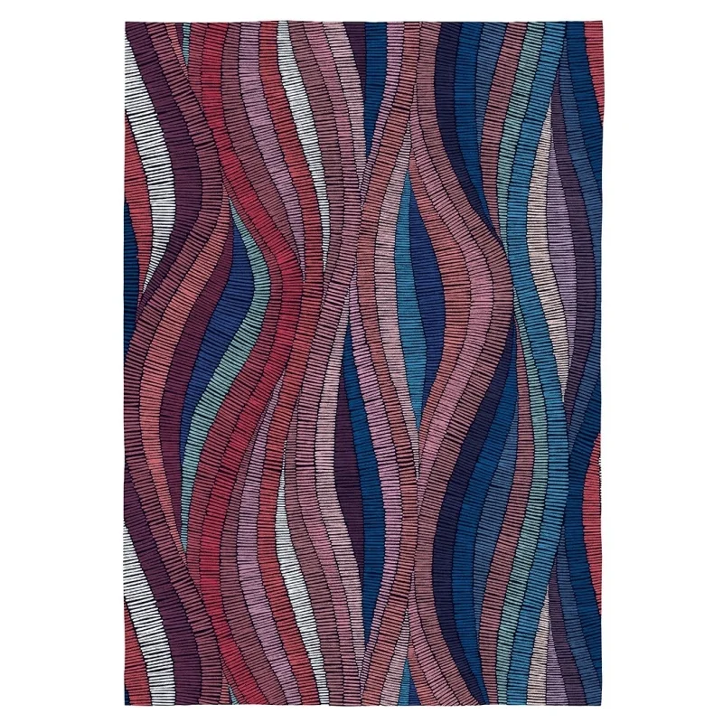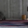La alfombra Rodier Fils es una alfombra rectangular de estilo moderno y multicolor. Predominan los colores lilas y morado combinados con diferentes tonos de azules. Es una alfombra elegante que se puede adaptar a varios estilos decorativos. Está fabricada en España con 100% algodón reciclado.