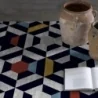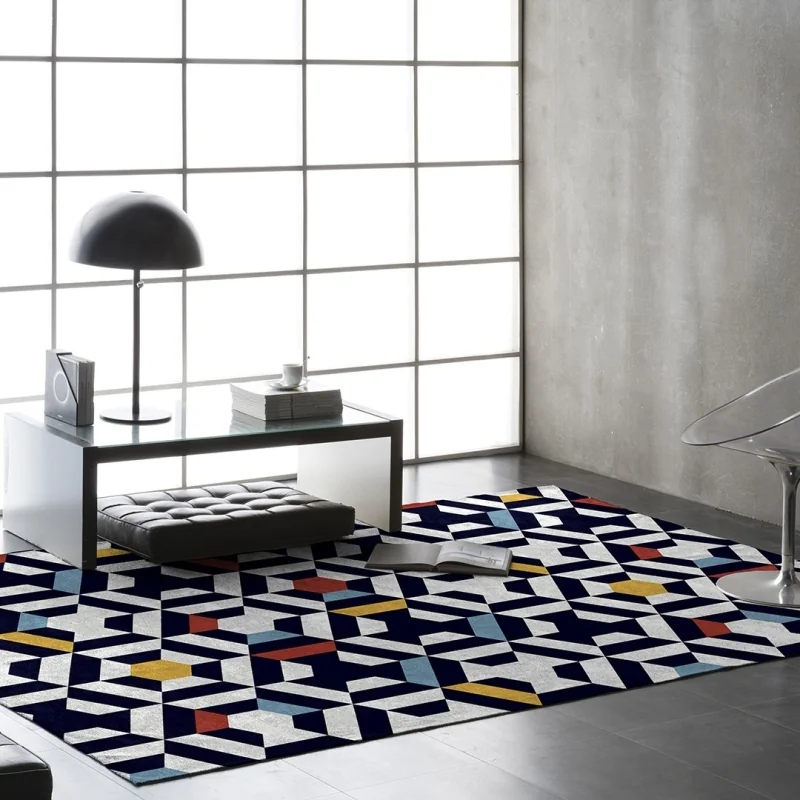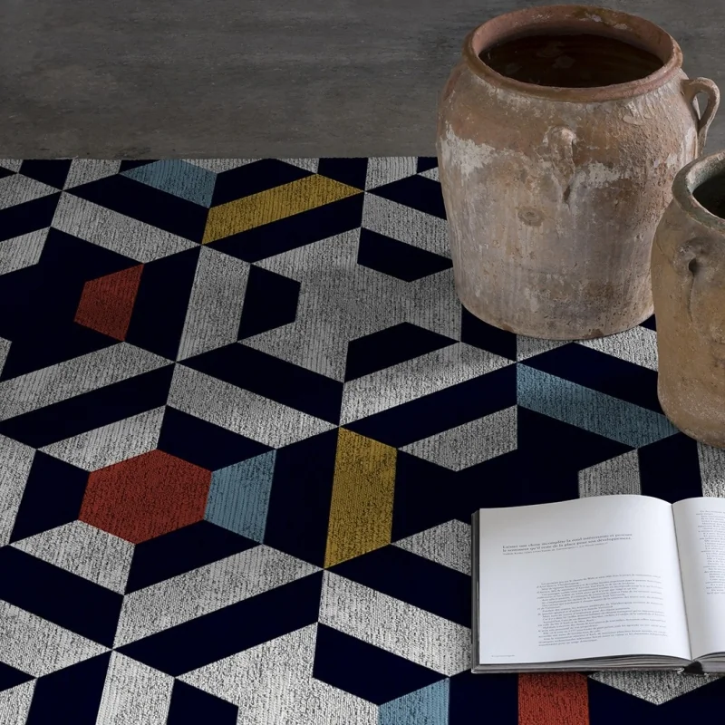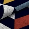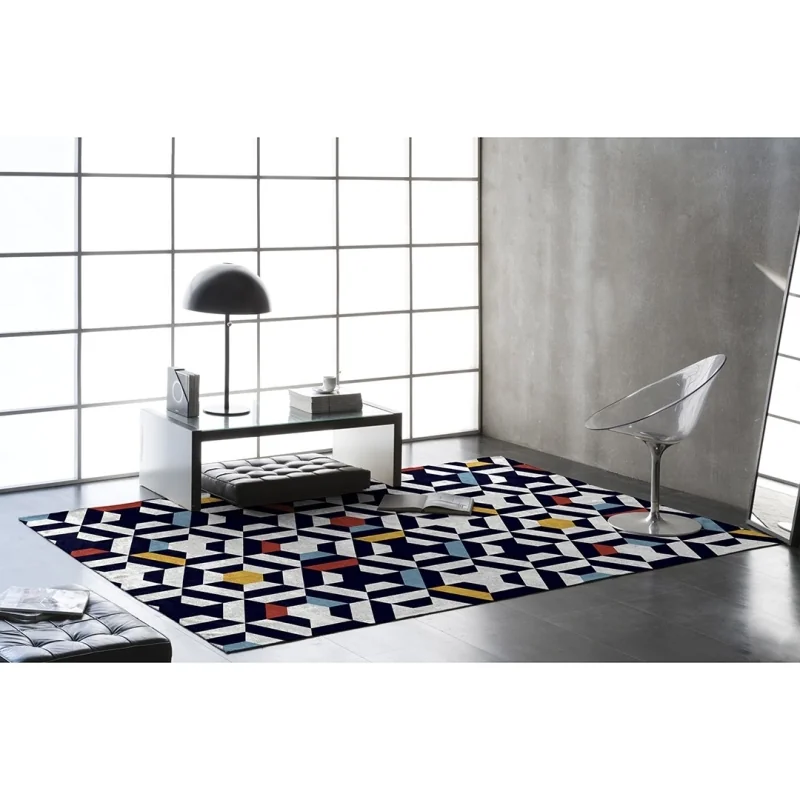 La alfombra Rodier Twist es una alfombra rectangular multicolor que destaca por su dibujo geométrico. El dibujo se compone de varias figuras geométricas uniformes principalmente en azul marino, con toques de otros colores como rojos y amarillos sobre un fondo blanco. Es una alfombra de corte muy moderno, ideal para habitaciones minimalistas, modernas o poco sobrecargadas pues la alfombra asumirá mucho protagonismo. Fabricada en España con 100% algodón reciclado.