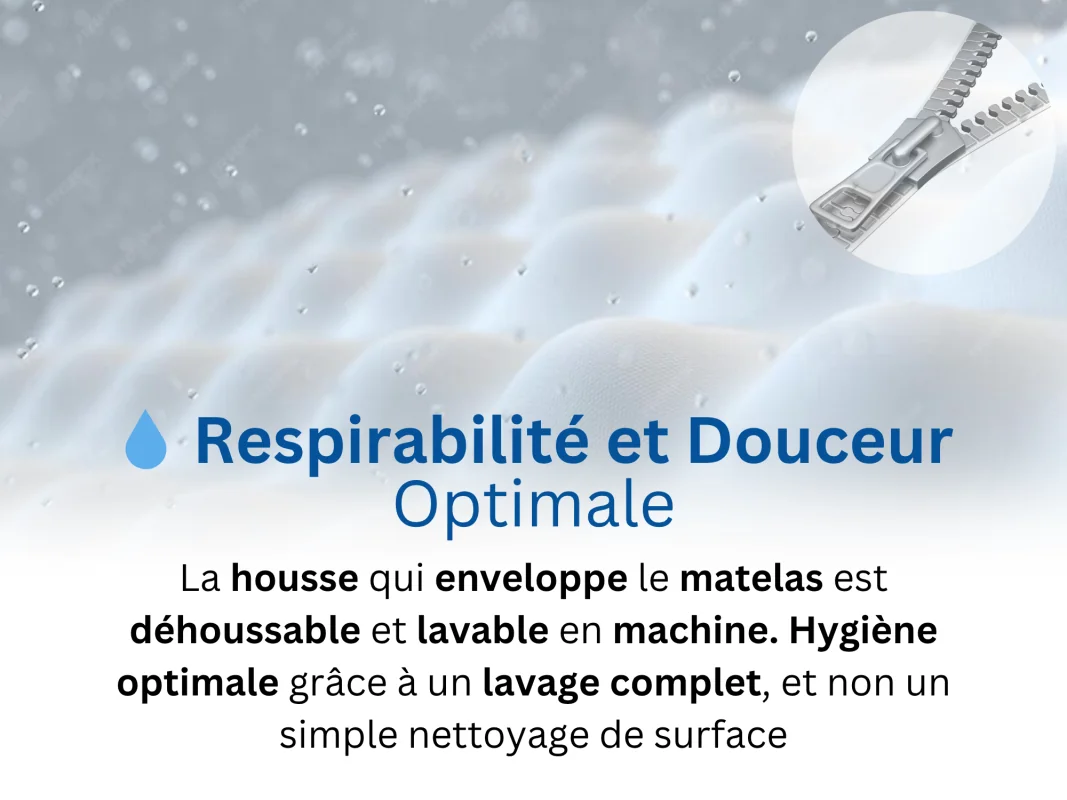 At the heart of our mattress lies an inner core of 15 cm of High Density foam of 33 kg /m³, ensuring robust and durable support. This balance is ideally complemented by 5 cm of 60 kg /m³ memory foam with cooling gel microcapsules, offering a unique thermoregulatory response and adaptive comfort to each silhouette.