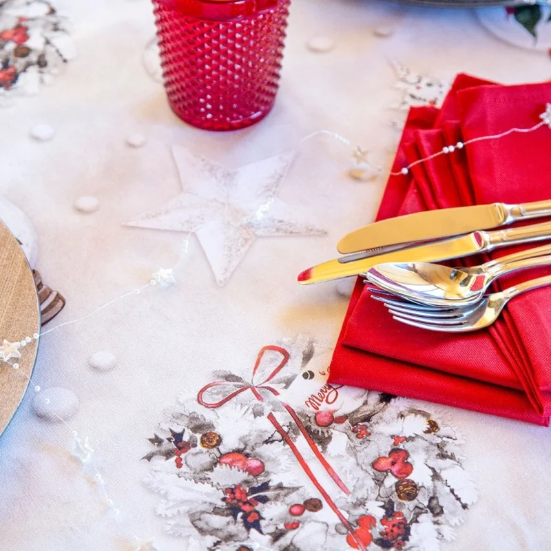 Mantel de algodón estampado con motivos navideños. Decora tu mesa esta Navidad con los mejores diseños y sorprende a tus invitados. Fácil lavado y planchado, práctico y de fácil almacenaje.