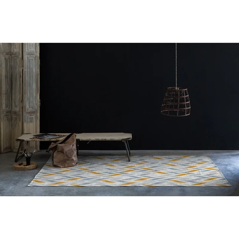 De Rodier Ennaes alfombra is een rechthoekige alfombra in een moderne en veelkleurige stijl. Het is samengesteld uit een tekening bestaande uit verschillende geometrische figuren met verschillende blauwe tinten gecombineerd met andere in gouden oker op een witte achtergrond. Het kan worden aangepast aan een verscheidenheid aan decoratieve stijlen, waarvan sommige pasteltinten en meestal koude kleuren zijn die ideaal zijn voor decoraties in Scandinavische stijl. Ennaes wordt in Spanje gemaakt van 100% gerecyclede stof.