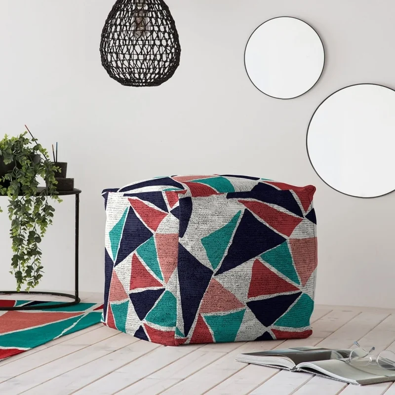 O pufe Rodier Adame é um pufe moderno e multicolorido. Adame forma diversas figuras triangulares de cores diferentes, principalmente marinho, turquesa e vermelho sobre uma base de cor natural. Pode ser adaptado a vários estilos decorativos, especialmente a espaços minimalistas onde se pode destacar com elegância. É fabricado na Espanha com algodão 100% reciclado. Não se esqueça de combiná-lo com o tapete a condizer. Disponível em dois tamanhos