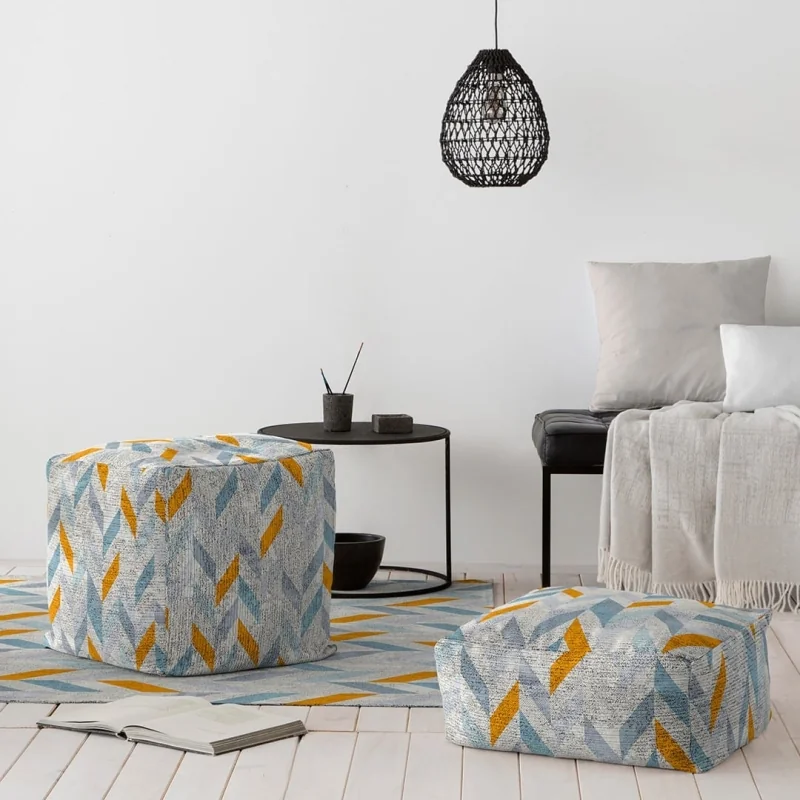O pufe Rodier Ennaes é um pufe moderno e multicolorido. Ennaes é composto por um desenho composto por diversas figuras geométricas em diferentes tons de azul combinadas com outras em ocre dourado sobre fundo branco. Ennaes pode ser adaptado a vários estilos decorativos, mas os seus tons pastel e principalmente as cores frias tornam-no ideal para decorações de estilo nórdico. Ennaes é fabricado na Espanha com algodão 100% reciclado. Não se esqueça de combiná-lo com o tapete a condizer. Disponível em dois tamanhos