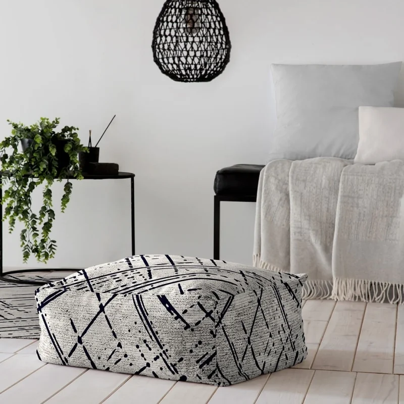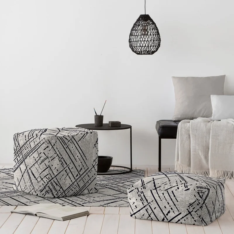 O pufe Rodier Mik é um pufe de estilo moderno na cor branca. O seu desenho é composto por várias linhas abstratas sobre fundo branco criando uma composição moderna que se adapta a vários estilos decorativos, embora seja perfeita para um estilo minimalista. É fabricado na Espanha com algodão 100% reciclado. Não se esqueça de combiná-lo com o tapete a condizer. Disponível em dois tamanhos